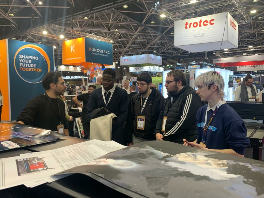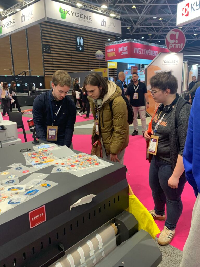 Ils ont pu découvrir au gré de leur visite, des techniques de pose de vinyle, différents procédés de gravure, les imprimantes DTF permettant l’impression sur film pour transfert et la sublimation pour le flocage sur tissus. Ils ont également assisté à une démonstration sur un traceur Roland, dont notre lycée sera prochainement équipé.